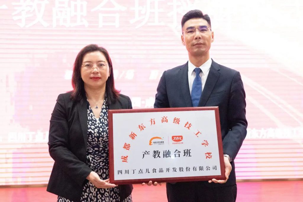 开幕式上,成都新东方高级技工学校党支部书记赵远与丁点儿食品市场总监屈咏梅共同完成“丁点儿产教融合班”授牌仪式,标志着双方在川菜教育领域的深度合作迈入新的篇章。
