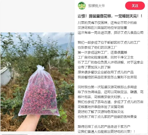 南充市烹饪协会在公众号刊文,肯定了丁点儿食品在推动川菜发展做出的贡献,对丁点儿高品质特色川调产品的风味给予了高度评价。成都隅园餐饮探索者则以视频形式记录了活动实况:走进贡椒之乡,了解食材根源。