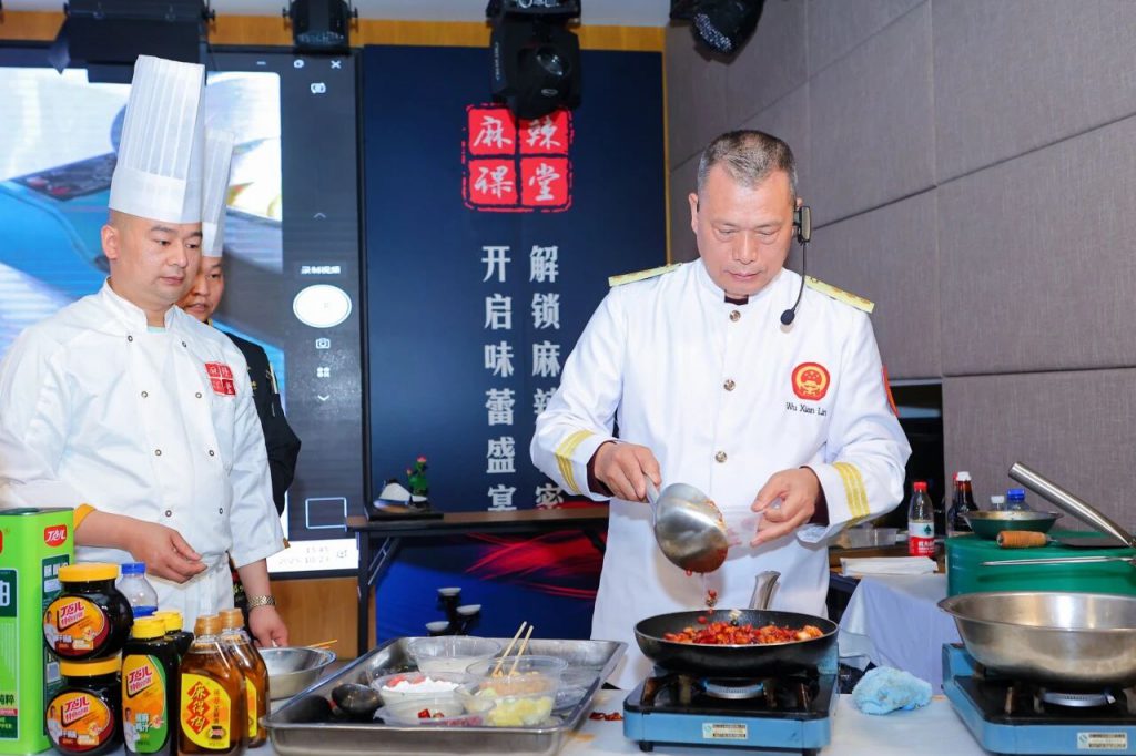在“麻辣课堂”的核心环节,中国川菜大师伍贤林、川菜技能大师姚有平、成都工匠黎云波等大师以经典菜品为蓝本,融入创新烹饪理念,现场演绎了沙姜猪手拼鲍鱼、宫保鸡丁、香辣爆炒腰块三道惊艳全场的教学菜品。