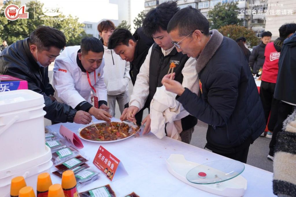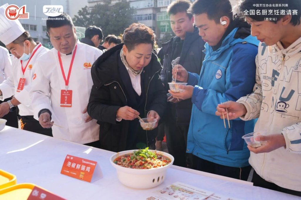 丁点儿菜品研发工程师更是现场操作——以干锅酱烹制天府炝锅鱼、用泡椒酱打造泡椒鲜锅鸡……香气四溢的菜品引得围观者纷纷试吃,赞不绝口!有选手边品尝边竖起大拇指:“这鱼外酥里嫩,酱香透骨,回家我就用丁点儿干锅酱试试!”