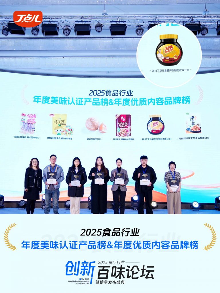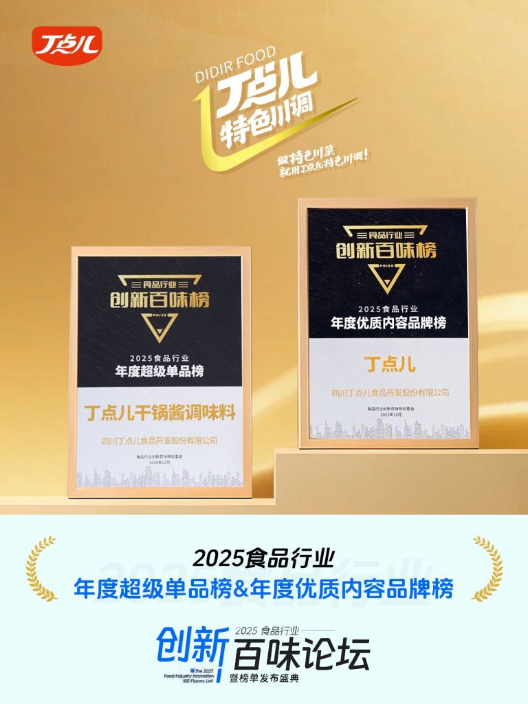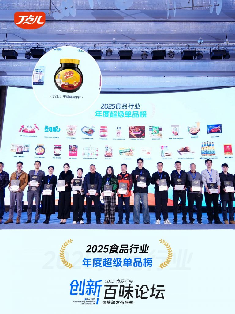 12月23日,在“共栖·2025食品行业创新百味论坛暨榜单发布盛典”上,丁点儿食品以明星产品干锅酱及优质品牌内容,成功摘得“年度超级单品榜”与“年度优质内容品牌榜”双项荣誉,展现了企业在产品力与品牌影响力上的双重实力。